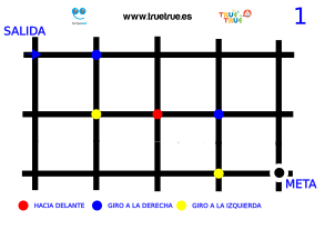Grid 1 de trabajo para el robot True True. Dificultad 1. Programa el recorrido del robot, desde la SALIDA hasta la META, teniendo en cuenta las indicaciones en las intersecciones coloreadas. Imprimir con impresión láser color. |
