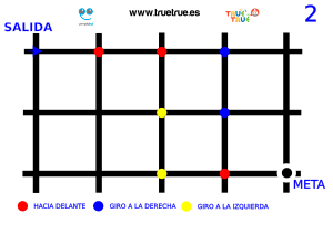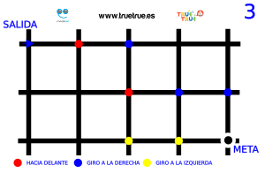 Grid 3 de trabajo para el robot True True. Dificultad 3. Programa el recorrido del robot, desde la SALIDA hasta la META, teniendo en cuenta las indicaciones en las intersecciones coloreadas. Imprimir con impresión láser color. |