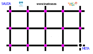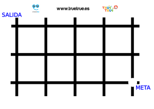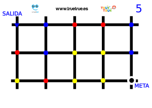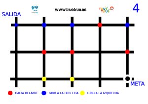 Grid 5 de trabajo para el robot True True. Dificultad 5. Programa el recorrido del robot, desde la SALIDA hasta la META, teniendo en cuenta las indicaciones en las intersecciones coloreadas. Imprimir con impresión láser color. |