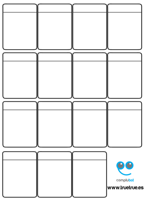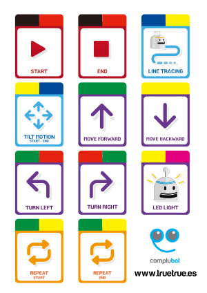 Tarjetas de programación en blanco para el robot True True Descarga tarjetas de programación en blanco para el robot True True. Con ellas podrás construir tu propio lenguaje de programación, manteniendo la codificación de colores original del robot True True. Imprimir a doble cara en papel de 160gr (mínimo) con impresión láser color. |